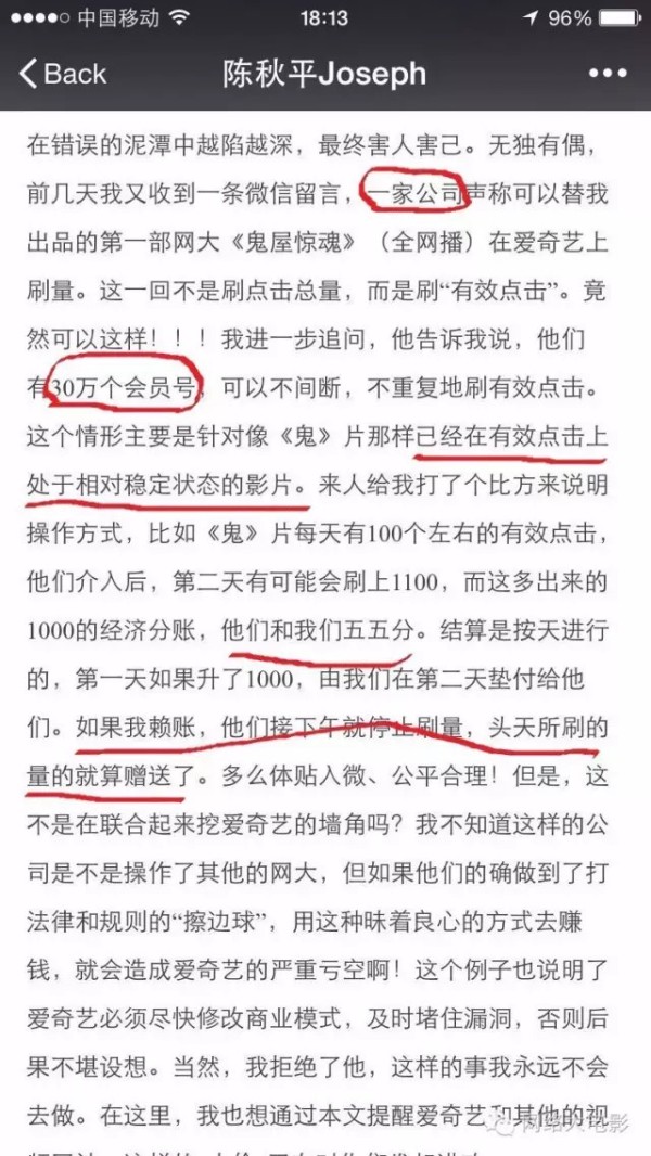 防范和打击这种刷量需要平台立即修改商业模式,填补漏洞! 此事一经曝出,小编立即暗访了淘宝一些刷量的店家,大部分表示目前还没有这样的业务。据小编推测,淘宝刷量还停留在小作坊的个人行为,这种大规模购买会员模式需要很大的投资,风险较大,且从陈秋平老师反映的情况来看,以公司名义采购和合作的可能非常大,且他们必须事先挑选片子,再有目的的联系片方,隐蔽性更高。 我们也第一时间联系了爱奇艺网络大电影的相关负责人,爱奇艺方表示,他们反盗刷部门目前尚未检测到这种情况,而且防盗刷系统暂时可以处理这种刷量行为,对方和陈秋平老师说的那种情况几乎实现不了,但是也不排除可能性,现在平台高度关注,正派专人查实。