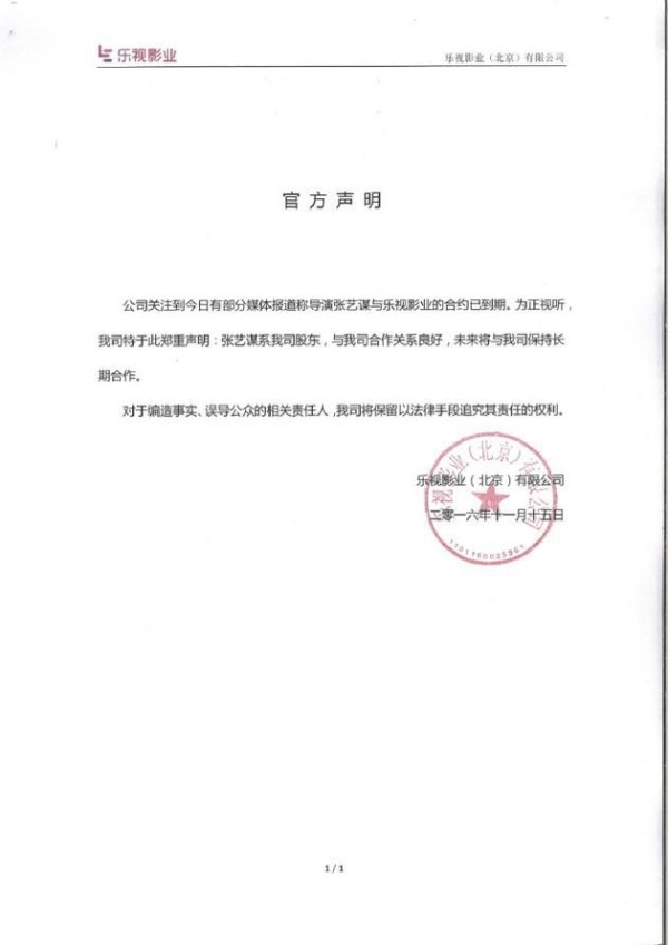 2016年11月15日,乐视影业官方微博发出澄清声明,表示张艺谋仍是乐视影业股东,双方合作关系良好,未来还将长期合作。