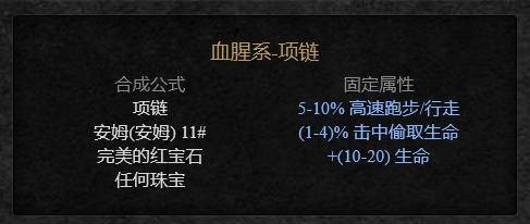 中后期吸血项链也是有很高的制作价值,适用于大量的物理玩法,属性也以+2职业技能。高生命,法力,20力量,高抗性等属性为佳。