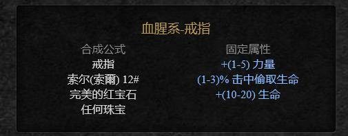 这个公式主要是制作三种类型的戒指,一种是双吸戒指(吸法5%,吸血7%),高力量(15以上),生命法力,抗性等属性。一种是高施法(10%施法),其余属性类同(无吸法属性)。第三类是命中戒指,这一类相对需求较少,主要是命中100以上,其他属性类同。