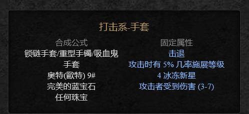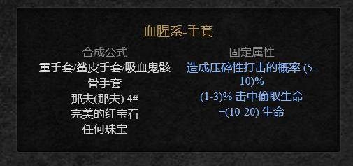 制作最广泛的手工手套,可制作极品的标马手套,属性为+2标枪技能,+20攻速,双 吸,生命,抗性等属性。其他玩法不需要技能,其他属性类同。极品属性也是可遇不可求,如果出了你可以大喊一声(卧槽),然后在头条让广大条友围观。