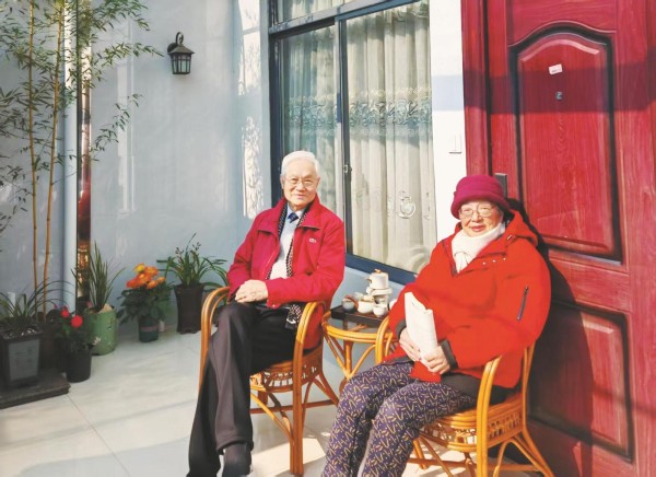 江可凌(左)与妻子在八字桥畔的四合院里享受悠闲时光。