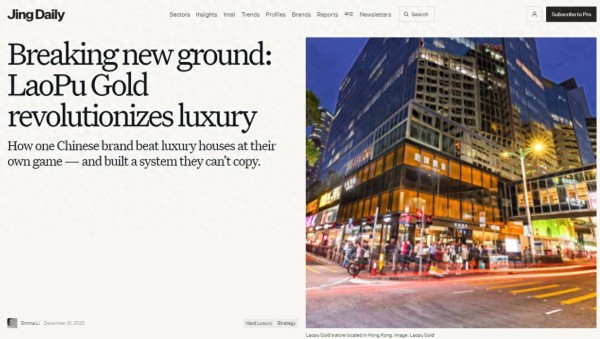 【环球网消费综合报道】2025年12月31日,长期关注奢侈品行业的美国权威时尚媒体Jing Daily(精奢商业)发布年底行业收官文章,称来自中国的老铺黄金正在颠覆西方奢侈品长期依赖的Logo 崇拜、名人效应与稀缺故事所支撑的品牌价值结构,用中国经典文化、传世工艺、极致审美和可以穿越时间周期的产品,重构全新的价值消费体系。