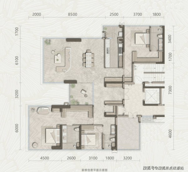 此户型为3室2厅3卫的设计格局,得房率惊人地高达120%。其超过40㎡的创新边厅,为家庭营造出亲密无间的生活场景。独特的270°全景舱观景视野,让居住者仿佛置身于美妙的自然画卷之中。主卧更是配备了步入式衣帽间以及度假酒店式的休憩空间,充分满足了改善型家庭对于高品质生活的追求。 215㎡沄璟户型