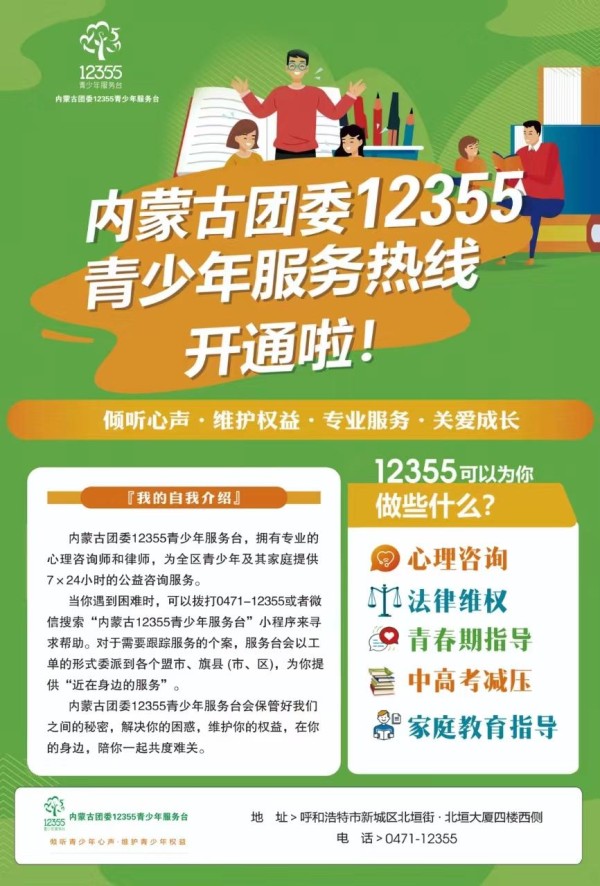 欢迎拨打0471-12355内蒙古团委12355青少年服务热线或通过“内蒙古12355青少年服务台”小程序寻求专业帮助。