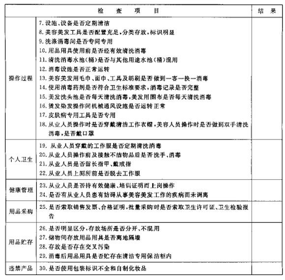 第五章 卫生管理第十七条 卫生管理组织、人员要求 (一)美容美发场所的法定代表人或负责人是该场所卫生管理的第一责任人,对场所的卫生管理负全面责任。 (二)美容美发场所应当设置卫生管理职责部门或专(兼)职卫生管理人员,负责场所卫生管理的具体工作。专(兼)职卫生管理员应当具有从事美容美发场所卫生管理工作的经验。 第十八条卫生管理工作职责 (一)制定内部卫生管理制度和岗位卫生责任制,依据《美容美发场所卫生管理自查建议项目》(附录3)制订卫生检查计划,规定检查时间、检查项目及考核标准,落实奖惩措施。检查服务过程的卫生状况并记录,对检查中发现不符合卫生要求的行为及时制止并提出处理意见。 (二)制订从业人员的卫生培训教育计划和考核办法,组织从业人员参加卫生法律、法规、规范、标准和场所卫生知识、各岗位操作规程等的培训学习和考核。建立从业人员卫生知识培训管理档案。 (三)组织从业人员进行健康检查,督促患有有害美容美发场所卫生疾病的人员调离其直接为顾客服务的工作岗位。建立从业人员健康体检卫生管理档案。 (四)督促从业人员严格执行《公共场所卫生管理条例》和《理发店、美容店卫生标准》的规定,及时复核、办理有关卫生证件、证明,依法从事经营活动。建立场所卫生管理档案。 (五)接受和配合卫生监督机构对本场所进行卫生监督检查,并如实提供有关情况,不得拒绝或隐瞒。 (六)美容美发场所内不得加工、制作食品。有食品经营的,应当建立索证制度,其经营须符合《中华人民共和国食品卫生法》的相关规定。 (七)参与其他保证场所卫生的有关管理工作。 第十九条 证照管理 美容美发场所及从业人员证照齐全,《卫生许可证》悬挂在场所醒目处。 第二十条 卫生档案管理 (一)美容美发场所许可申报、卫生设施设备等的基本资料。 (二)美容美发场所的相关卫生法律法规、规范标准和文件。 (三)美容美发场所的卫生管理制度、岗位卫生责任制、卫生检查计划、检查项目及考核标准。 (四)从业人员健康体检、培训管理档案和奖惩记录。 (五)美容美发场所的卫生监督监测档案,化妆品和用品用具的卫生质量检测报告、有效证明材料等。 (六)卫生设施设备维护和公共用品用具消毒的工作记录,外送洗涤消毒的,要有用品洗涤消毒记录。 第二十一条 危害健康事件报告 (一)经营者应当建立危害健康事件的报告制度。经营单位负责人和卫生管理员为责任报告人,其他人员为义务报告人。 (二)一旦发生危害健康事故,经营场所报告人要在事故发生后的24小时以内报告当地卫生部门。 (三)发生危害健康事故的场所,经营者应当立即停止相应的经营活动,及时协助医务人员救治事故受害者,并负责保护好事故现场,同时,积极配合卫生部门做好现场事故的调查、取证工作,控制健康危害的蔓延和恶化。