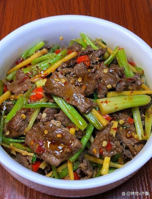 4、继续翻炒至芹菜断生以后,再加入炒好的牛肉一起翻炒均匀入味,即可出锅开吃。
