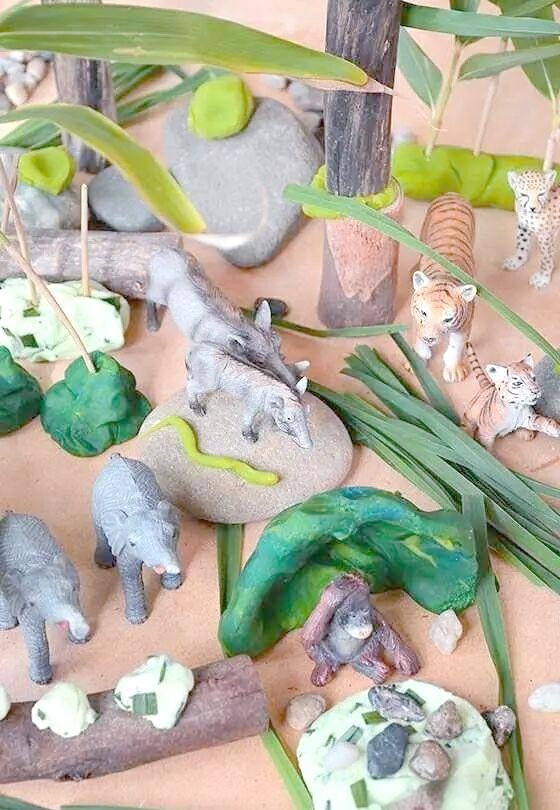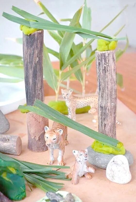 利用彩泥、石头、粗树枝以及真实的草,我们可以共同搭建出一片广阔的丛林。若再点缀上几片树叶,将更生动地展现出丛林的繁密与生机。