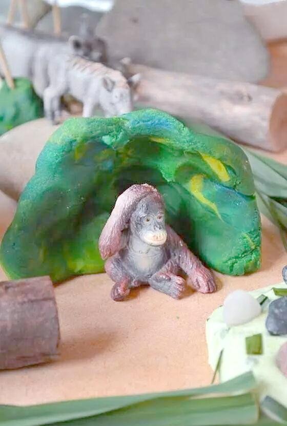 将几种不同颜色的彩泥巧妙混合,我们可以塑造出热带丛林中不可或缺的石头元素,为那些大型动物,如大猩猩,提供隐蔽的栖息之地。