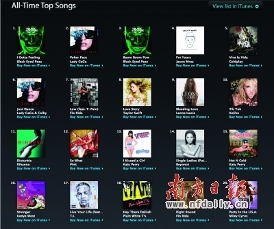 苹果的iTunes商店早在2010年2月24日那一天歌曲下载量突破100亿首,巧合的是,这天正好是史蒂夫·乔布斯的55岁生日。