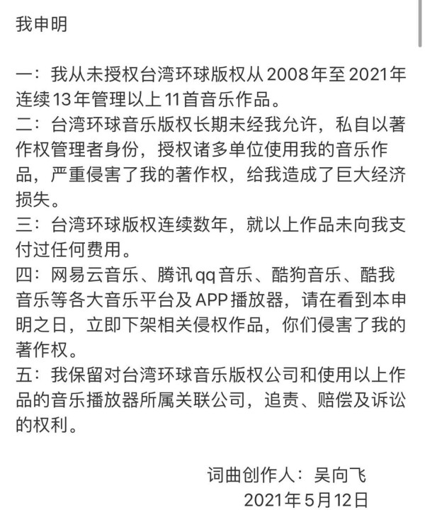 近日,音乐人吴向飞在微博发布一则申明,表示对陈奕迅、杨宗纬、萧亚轩、许志安等艺人的共11首作品享有著作权。2008年到2021年间,某知名音乐版权公司未经吴向飞允许,私自授权诸多单位使用这些音乐作品,且未向他支付任何费用。