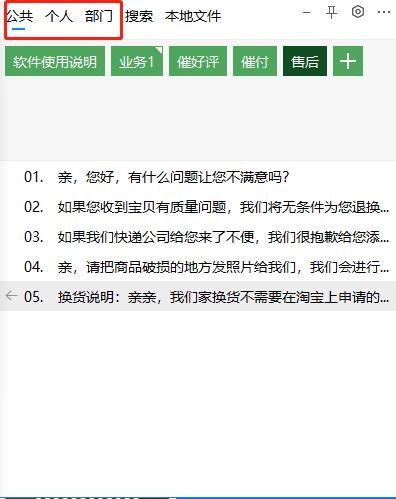 快捷回复助手平台采用“公共话术+部门话术+个人话术”的结构,企业可以将优质的话术回复放到公共话术中,实现企业团队多人共享,团队中所有客服都可看到并使用这一套优质话术,对话技巧统一高标准。并且支持多人同时编辑,实时同步,多设备漫游。对于不同的部门,部门经理也可以将优质话术放到对应的部门话术中,供部门员工使用。如果员工个人有比较好用的或是常用的话术,也可以将其放到个人话术中。