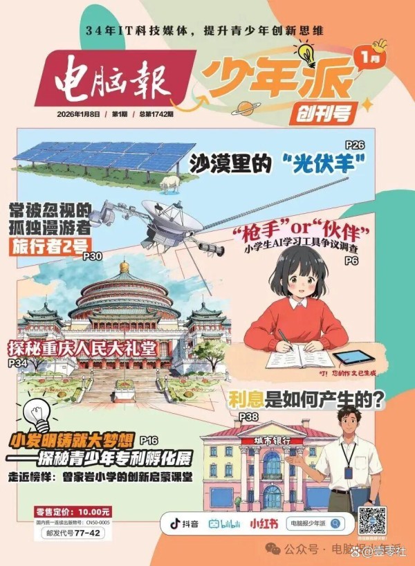 由拥有34年IT科技领先媒体积淀的《电脑报》精心策划,一本专为小学全年龄段科创优等生定制的泛科普报刊——《电脑报·少年派》创刊号在2026开年重磅上市,正在邮局和各大电商平台开放订阅,邮发代号77-42(科技新知)和77-43(科创校园)。