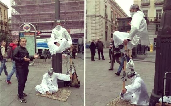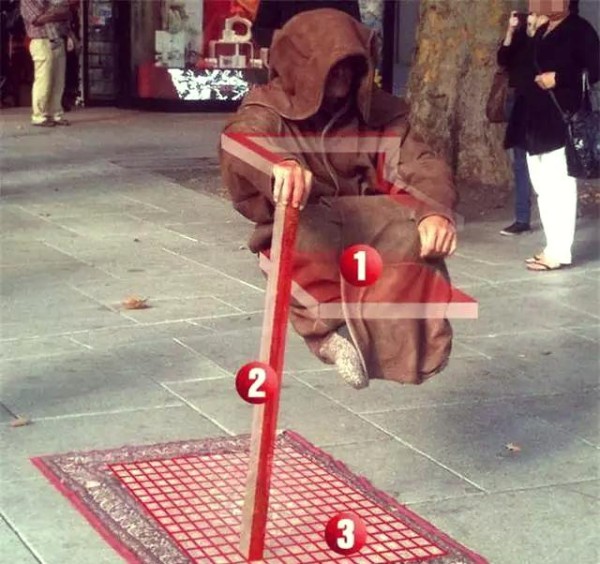 通过观察这两张图片,你是否已经明白了其中的原理?哈哈,其实这背后的秘密并不复杂。 双人版本揭示关键在于道具的设计,或者是通过图片所展示的复杂装置,其基础原理依然简单,只是创造了一个视觉假象。这些技巧都依仗于科学与器械的结合,而非神秘力量。所谓的街头人体悬浮术或人体悬空魔术,都只是利用工具制造的假象,它们并不能违背科学的基本原理。