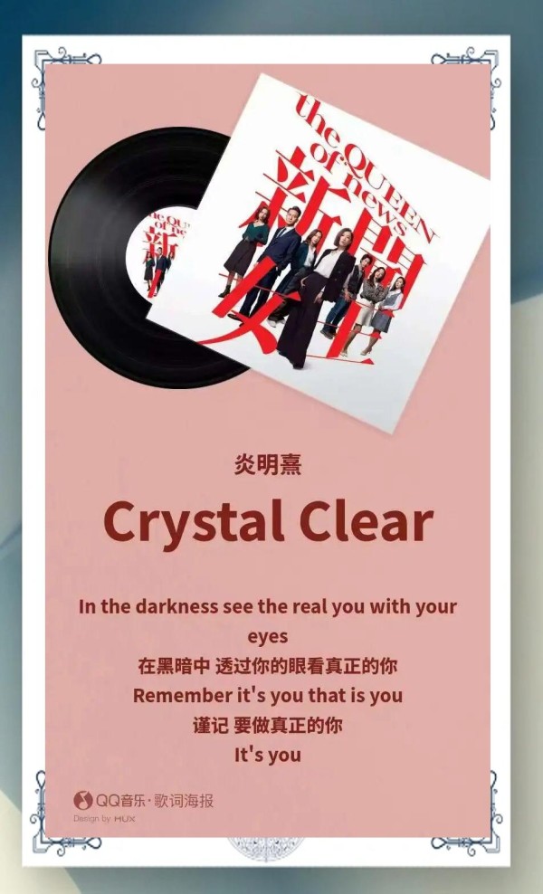 《Crystal Clear》是炎明熹演唱的《新闻女王2》片尾曲,其清澈的嗓音为这首歌曲注入了纯净的力量。在繁忙的生活中,这首歌曲如同心灵的一股清泉,让人在聆听中感受到宁静与美好。它不仅是我今年最喜欢的歌曲,更成为了我心灵的慰藉,让我在忙碌之余找到片刻的宁静。