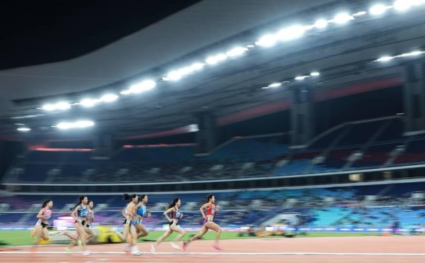 田径赛事在广东奥体中心持续至夜幕降临,其中 1500米和10000米的长距离对决气氛紧张,选手们策略性比赛,引发现场观众的全情投入。男女选手依次登场,跑道上的节奏时而紧张时而舒缓,既有选手突然发力超越,也有队伍通过策略性拉扯来消耗对手体力。观众们全神贯注,生怕错过任何一个精彩瞬间。