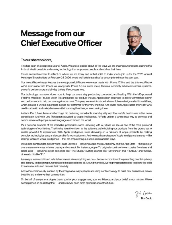 当前正是回顾成果的合适时机。在此,我诚邀各位于 2026 年 2 月 24 日参加苹果 2026 年度股东大会,届时我们将共同回顾并庆祝过去一年取得的重要进展。