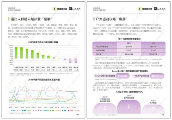 《2024年度运动流行趋势指南》披露,2023 年是户外运动爆发的一年,骑行维持了前一年的热度,在网络曝光指数中稳居 TOP 3。而伴随着骑行热,运动人群对于内容的要求也在快速增长:2023年1月-10月,社交平台骑行相关的笔记发布量增速近400% ,笔记量超180万篇,「骑行」话题阅读量近 13 亿。在这样的趋势下,骑行相关活动、赛事也愈发受欢迎。