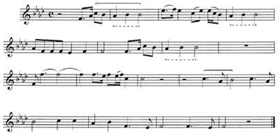舞蹈与音乐同步构成三大部分,每一部分的音乐均由两个对比性乐段组成(主歌和副歌),前段(主歌)是由较为规整的四个乐句组成的乐段,乐句之间是派生关系。后段(副歌)则是由两个对比性乐句组成的非规整乐段。第一乐句具有连接性质,它与第一段形成较强的对比。第二乐句则是以第一段开始的主题音乐材料为核心而展开的乐句,它在某种程度上讲具有再现的因素: