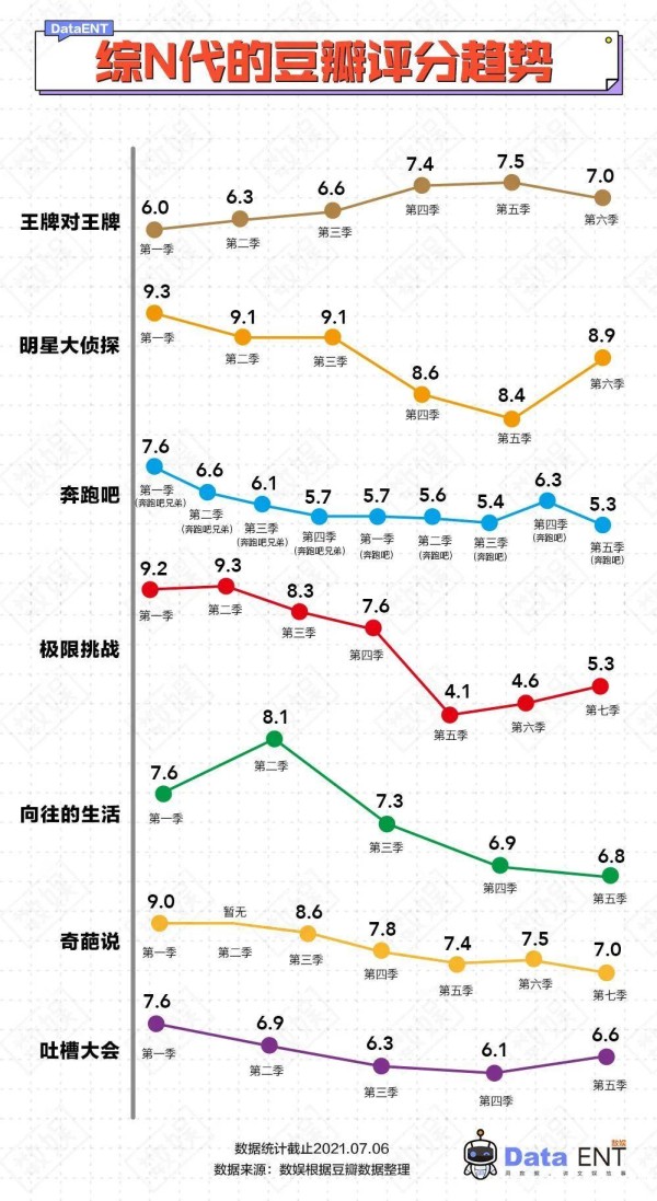 数小娱统计了上榜的几大代表综N代的豆瓣评分,除了更换了沈腾配贾玲得到了分数升高并成为收视王者的《王牌对王牌》外,基本上所有的综N代的豆瓣评分都在下滑,口碑综艺《明星大侦探》下滑的程度最小,其余的综N代,无论是《极限挑战》更换导演团队造成的评分断崖式下跌,或者类似《奇葩说》口碑较好阶段有序下跌从9跌到7,或者《吐槽大会》从7.6变成6.6,但点开评论,都能看到如前文所述的“综N代”经典评论。
