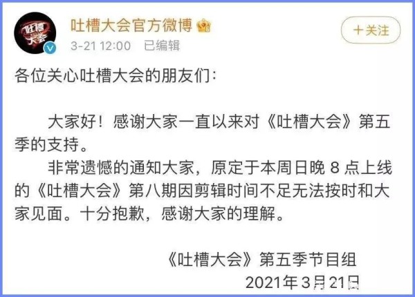 首先遭遇播出滑铁卢的是《吐槽大会5》,男篮国足式吐槽迅速火爆全网,“无差别攻击”在竞技比赛中的吐槽原本是球迷的狂欢,金句频出的节目收获了好评但吐槽效果很快反弹到节目自身,体育专场的下半期宣布停播,到目前为止,这期节目的下半集仍然没有播出。