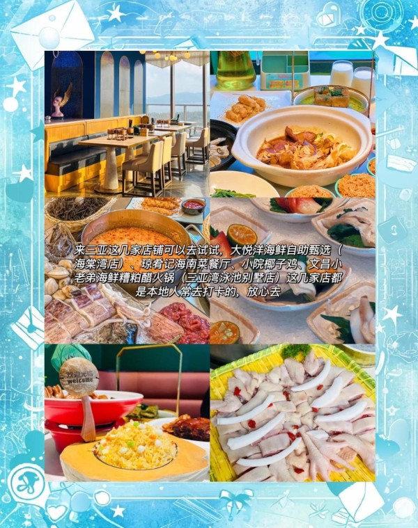 三亚美食推荐:来三亚这几家店铺可以去试试,大悦洋海鲜自助甄选(海棠湾店)、琼肴记海南菜餐厅、小院椰子鸡、文昌小老弟海鲜糟粕醋火锅(三亚湾泳池别墅店)这几家店都是本地人常去打卡的,放心去。