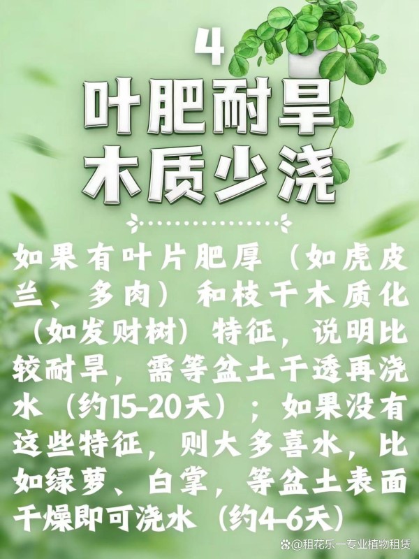 不同绿植浇水不一样:像发财树、虎皮兰这种叶片肥厚、枝干偏硬的,特别耐旱,盆土彻底干透再浇都不迟;而绿萝、吊兰这种叶片柔软的喜水植物,盆土表面发白了就可以浇水。