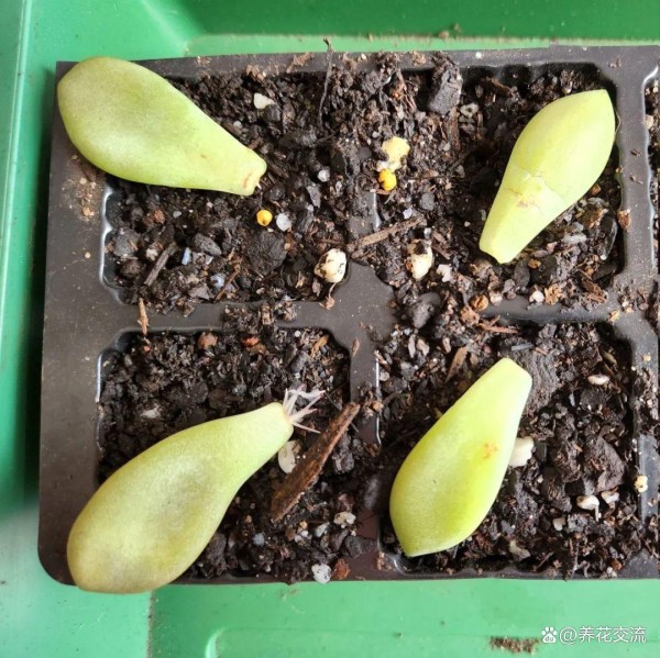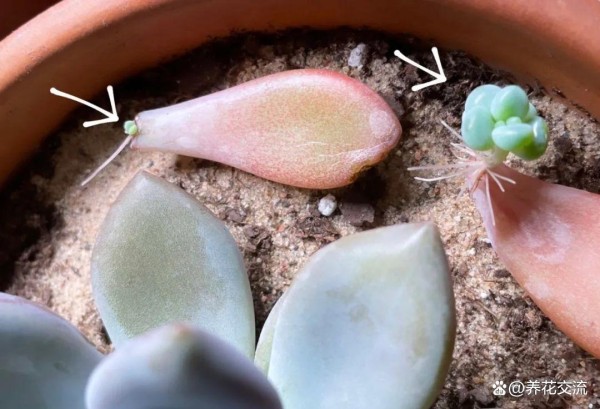 用叶片扦插繁殖的多肉,它们会在三四周之后逐渐长出根系和幼苗。
