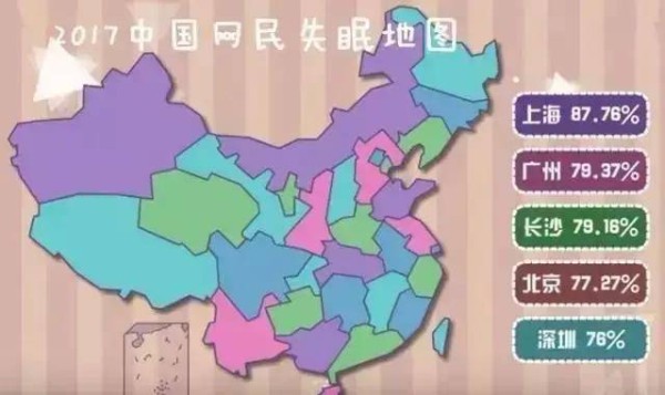 《2017年中国网民失眠地图》显示,全国的各城市失眠经历的人群比例中,上海位居第一,高达87.76%,其次是广州、长沙,北京。阿里健康联合阿里数据发布《打败失眠症趣味数据报告》中,一份中国“失眠之城”排行榜新鲜出炉,上海再次位列全国睡眠质量最差榜单第1位。