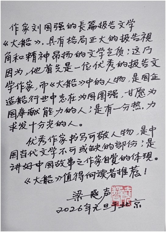 近日,由中国传记文学学会副会长、全国“骏马奖”获奖作家刘国强创作的长篇报告文学《大船》,引起作家、评论家的关注。新年伊始,中国报告文学学会在统揽全年发表、出版的报告文学大量作品中,经过专家沙里淘金般审慎评议和遴选,《大船》跻身12部“2025年中国优秀报告文学作品推荐”入选作品。
