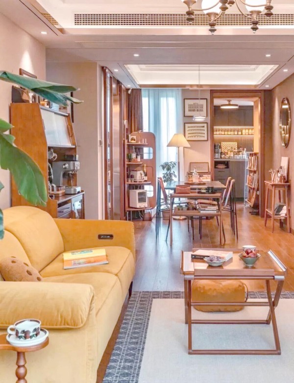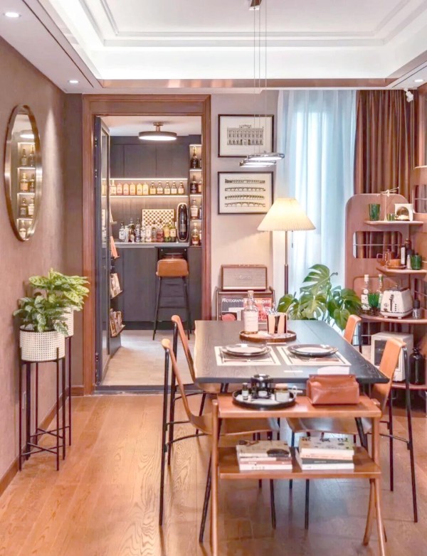 再来看硬装部分,天花板的设计颇为匠心独运,采用了简洁而大方的“双眼皮”吊顶,不仅巧妙地隐藏了管线,更使得整个空间显得井然有序、明亮宽敞。而灯光设计同样不失格调,主灯选用了一款既带复古风情又不占空间的样式,再辅以适度的筒灯进行点缀,既确保了充足的光照,又避免了过于压抑的空间感,与家居布局相得益彰。