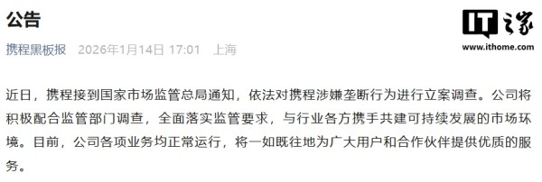 IT之家 1 月 14 日消息,市场监管总局今日宣布,市场监管总局根据前期核查,依据《中华人民共和国反垄断法》,对携程集团有限公司涉嫌滥用市场支配地位实施垄断行为立案调查。