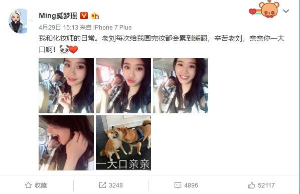 翻看奚梦瑶的微博看自拍照,奚梦瑶说“我和我的化妆师日常,老刘每次给我画完装都会累到睡翻,辛苦老刘,亲亲你一大口”仔细看了一下奚梦瑶的自拍照,鼻子确实没有“高峰”,不过一双大眼睛完美的掩饰了所有的缺陷。
