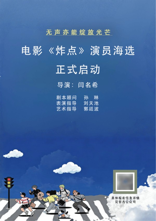 目前,《炸点》各项筹备工作正在有序推进。为真实呈现当代大学生精神风貌,还原热血舞蹈场面,影片决定面向全国开展演员海选,秉持"重潜力、看特质、求真实"的选角理念,旨在发掘那些兼具自然表现力和强烈共鸣能力的新面孔,尤其期待具备舞蹈基础、肢体表现力强,以及对青春题材有深刻理解的年轻人加入。