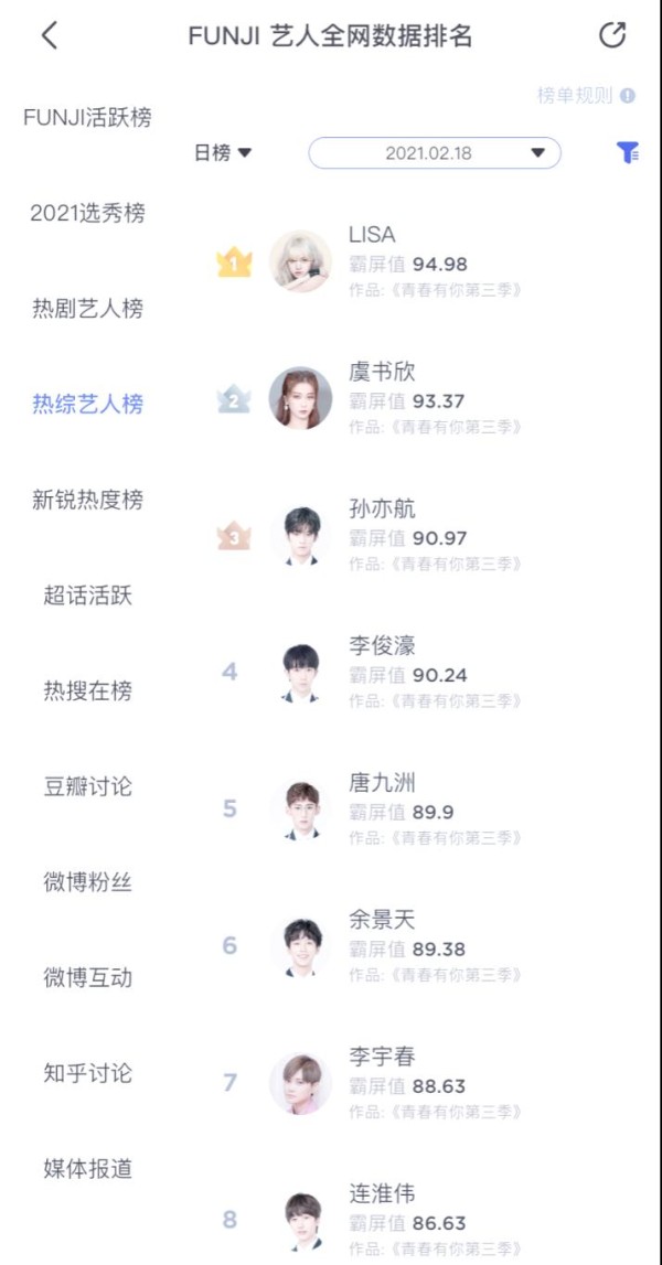 从导师的选择来看,两档节目与往年的差异并不显著。在《青3》中,Lisa凭借其独特的魅力吸引了大量话题和流量,这从FUNJI热综艺人榜的数据中可以明显看出。而虞书欣作为话题制造者,在首期节目后也备受瞩目,其他导师们各自的专业技能也满足了“组团”的需求。
