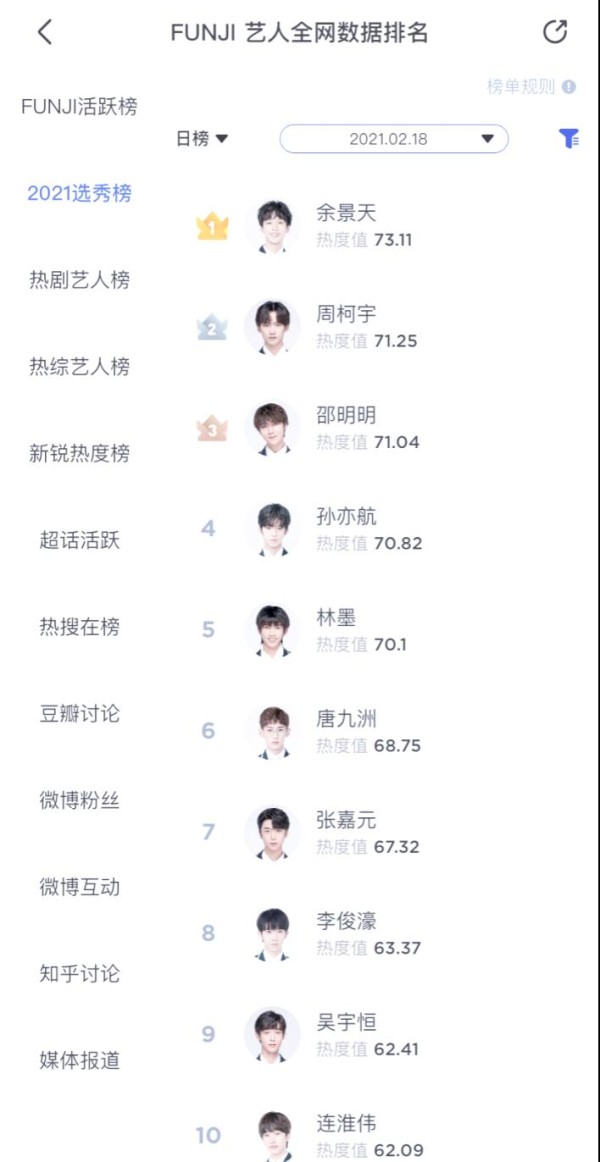 除了导师话题外,选手的参与度也是衡量两档节目传播策略差异的重要指标。根据FUNJI的艺人全网数据排名显示,目前《青3》与《创4》在2021选秀榜的前10名中,以55分的成绩并驾齐驱,展现出势均力敌的竞争态势。