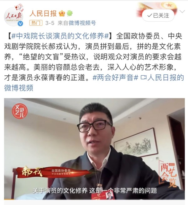 两会期间,全国政协委员、中央戏剧学院院长郝戎也在《两会艺览》节目中表明立场:“演员拼到最后,拼的是文化素养。”作为两会的关注热点,这个话题再次点燃了关于“绝望的文盲”的讨论。