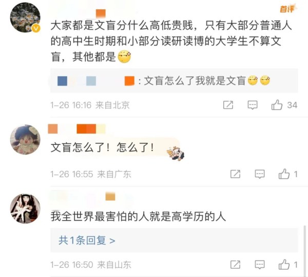 在“绝望的文盲”和类似话题“九漏鱼”(九年义务教育“漏网之鱼”,原指没完整接受九年义务教育的人,后泛指学识低的人)的评论区中,也不乏通过扭曲事实维护偶像的粉丝们,甚至有人发出“唯爱文盲”的评论。