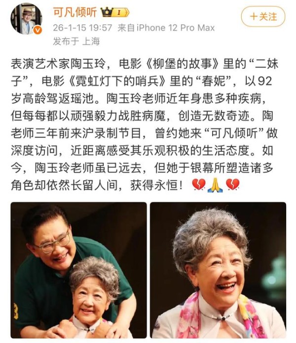 另一位圈内知名主持人曹可凡也在第一时间通过社交账号发文悼念,她讲述自己与陶玉玲老师的缘分,三年前陶玉玲还前往上海录制由曹可凡主持的访谈节目。
