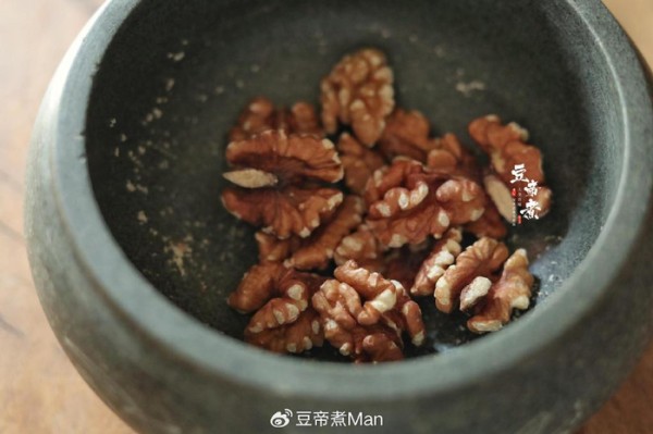2、待花生稍微冷却之后搓掉皮衣,然后倒入石臼或者是机器里捣成碎备用。接着把核桃仁也倒入捣成碎后使用,这里的材料要注意一下。花生碎和核桃碎,不要弄得太细。因为太细口感会有所偏差,当然了也不能粗糙得太离谱。核桃建议必下,因为核桃可是山西的名产之一。