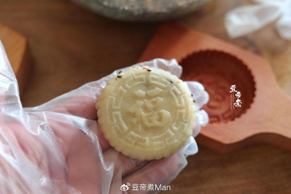 5、包制不需要完完整整的克数,因为每个人的模具不一样甚至不用模都能做。大致揪下一小块,掐成薄片包入一匙馅料密合封口。放入模具里压实敲出就可以了,想喜庆一些可点缀一个红点。