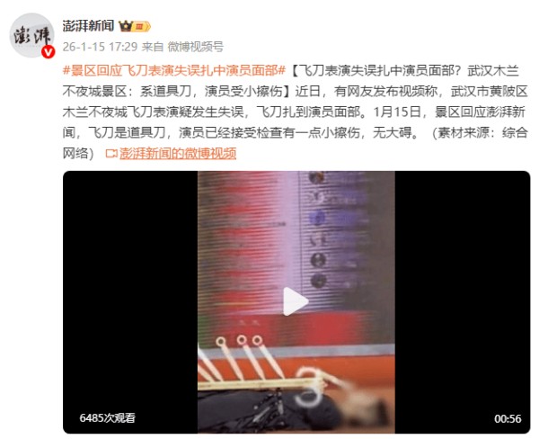 近日,有网友发布视频表示,武汉市黄陂区木兰不夜城在一场飞刀表演中疑似发生失误,飞刀扎到了演员的面部。1月15日,景区回应:飞刀是道具刀,演员已经接受检查有一点小擦伤,无大碍。