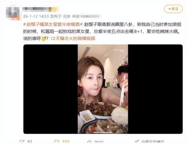 这次cue到杨幂,其实一点都不意外。杨幂在内娱的地位摆在那,随便哪个名字跟她沾上边,都能自带十倍放大效果。赵樱子虽然没和杨幂直接合作过,但“迪幂孟扎”这个梗早就把两个人硬生生绑在了一起,网友一提她就容易联想到杨幂。这次“半夜8+1”虽然没指名道姓,可指向性强到不行 熟悉她风格的人一看就知道又是熟悉的配方——先抛个普通八卦 再抖点含糊细节,最后留个让人脑补的大坑。