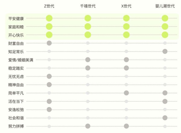 但国民对生活的整体认可度并不低:70% 的人觉得 “生活状态很好”,63% 表示 “接近理想状态”,甚至有超三分之一的人说 “重来一次基本不做改变”。这种满足感,源于 “平安健康”“家庭和睦”“开心快乐” 这三代人共通的幸福底色。