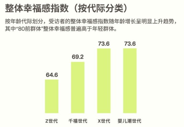 代际差异则更为鲜明:幸福感随年龄增长一路上升。61至79 岁的婴儿潮世代与 45至60 岁的 X 世代幸福感均达 73.6 分,而 29至44 岁的千禧世代 69.2 分,13至28 岁的 Z 世代仅 64.6 分。