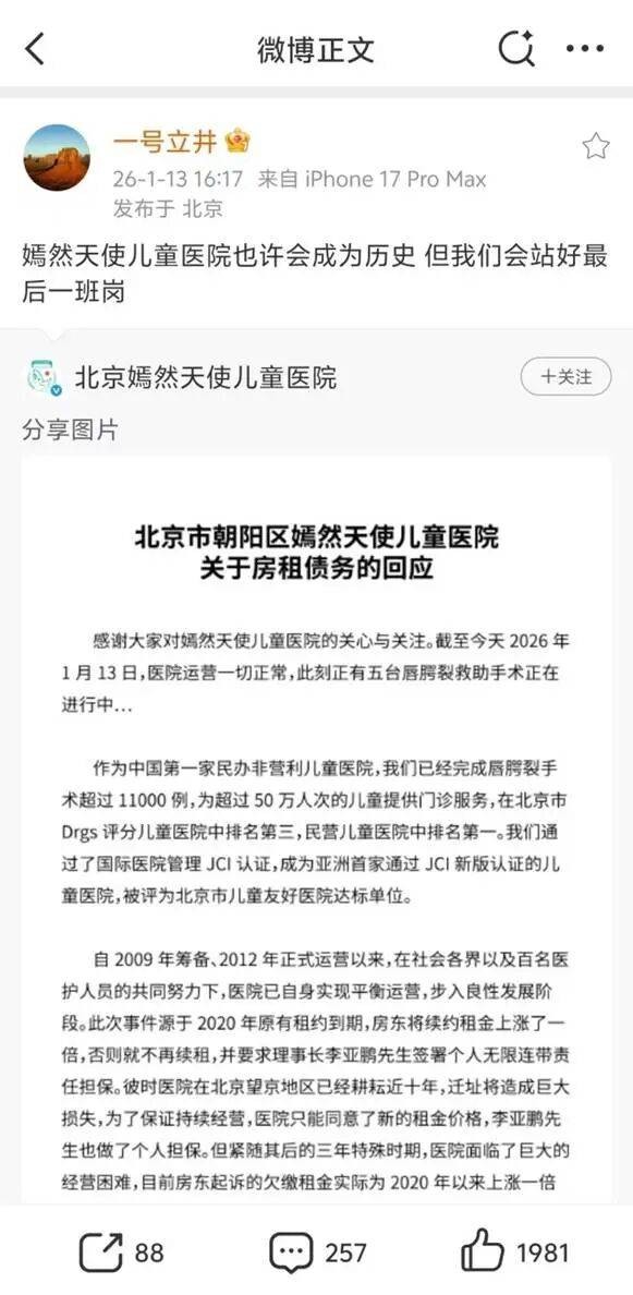 “嫣然天使儿童医院也许会成为历史,但我们会站好最后一班岗。”2026年1月13日,李亚鹏在社交平台转发了医院的官方回应,承认医院正面临房租债务危机。