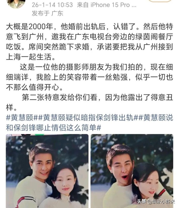 事情闹得这么大,还不是因为黄慧颐的爆料。她明确说2000年保剑锋曾向她求婚,然后又在2001年春节时婚前出轨。这消息一出,立马成了热搜话题。