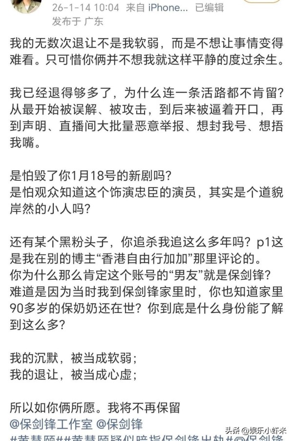保剑锋这小两口被黄慧颐指责得够呛。早在去年底,他们就开始应对所谓“出轨”、“妈宝男”等传言,搞了一通法律动作来保护名声。12月中还严正声明过,说网上那些造谣的都是瞎编,和事实严重不符。但你信吗?