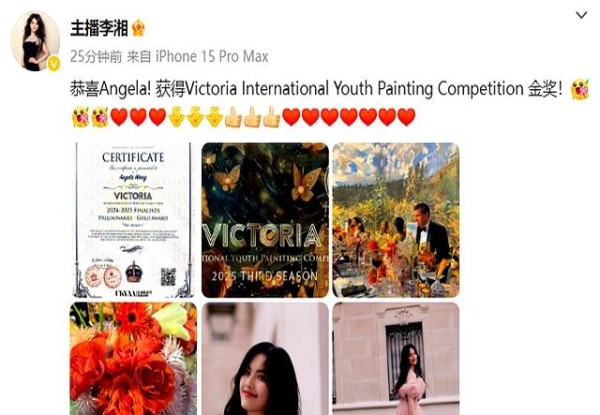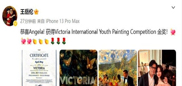 这幅画拿下了 Victoria International Youth Painting Competition 的金奖,李湘和王岳伦立马在微博上晒出证书,喜悦之情溢于言表。