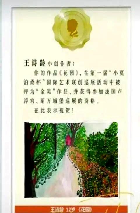 其实,早在2022年,王岳伦就曾在社交平台晒过王诗龄的绘画作品,当时她凭借一幅名为《花园》的作品获得了第一届“小莫泊桑杯”国际艺术联创巡演活动的“金奖”,还获得了在法国卢浮宫、斯万城堡巡展的资格。